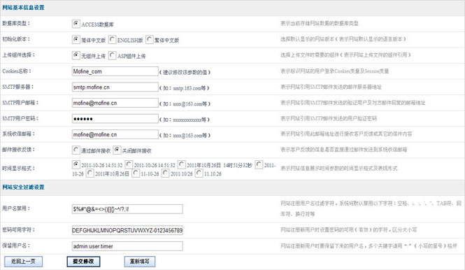 5.SMTP用户邮箱:(如:mofine @ mofine.com等) 表示网站引用SMTP邮件发送的验证用户及对方邮件回复的邮箱地址。