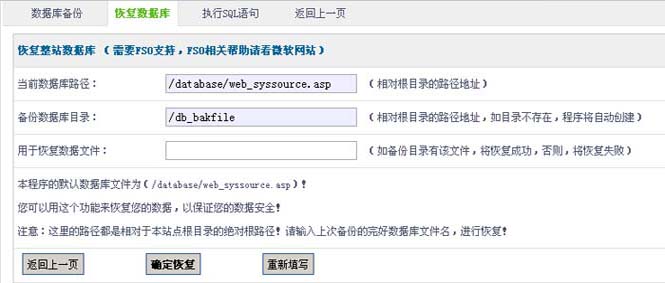 注意:这里的路径都是相对于本站点根目录的绝对根路径!请输入上次备份的完好数据库文件名,进行恢复!