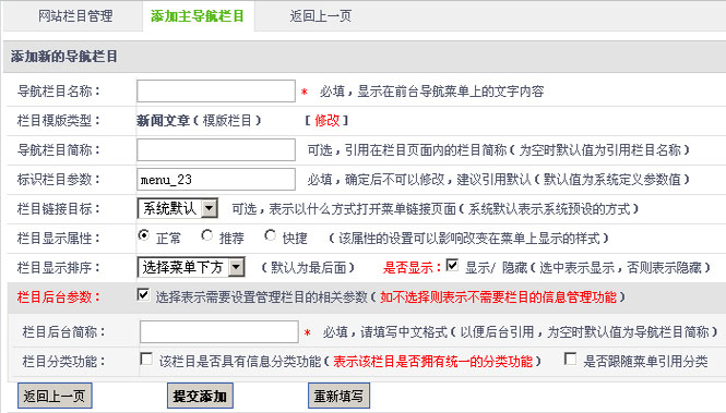 11.在“栏目后台参数”字段,如不选择则表示不需要栏目的信息管理功能。